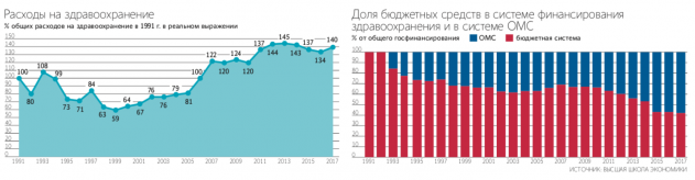 В бюджетной модели государство само и финансирует, и «лечит», в модели ОМС оно выступает заказчиком. Были большие ожидания, что эффективность системы здравоохранения вырастет при ОМС, пишут авторы доклада, они оправдались не в полной мере. Одна из причин – чиновники обязаны обеспечивать устойчивое финансирование клиник, а после майских указов президента Путина 2012 г. – еще и резко повысить зарплаты врачам и медперсоналу. Но есть и другие проблемы. Например, правила использования средств ОМС ограничивают возможности частных клиник: государственные имеют доступ к государственным субсидиям и могут «впрок» закупать медицинское оборудование – частники покупают за свои и дороже. Но в государственной клинике оборудование может годами не использоваться, обращают внимание авторы доклада: средства на приобретение нового томографа есть, но в системе ОМС не запланированы средства на оплату исследований на новом томографе.