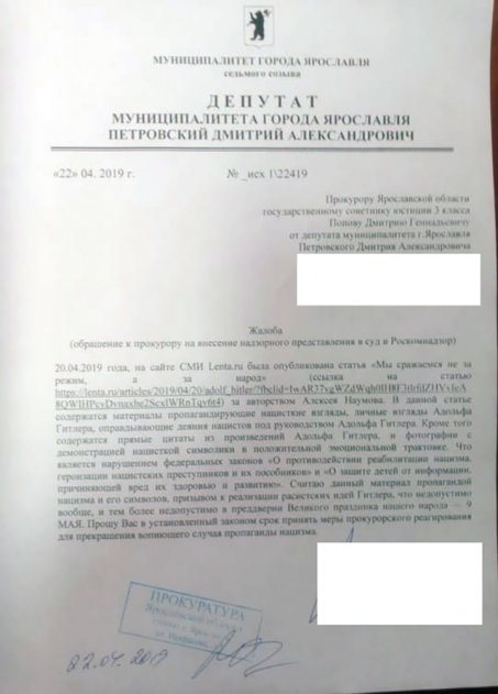Муниципальный депутат из Ярославля, доктор медицинских наук, хируг Дмитрий Петровский отнёсся к ситуации со всей серьёзностью и направил в прокуратуру (фото ниже) и Роскомнадзор запрос на проверку материала на нарушение двух законов «О противодействии реабилитации нацизма, героизации нацистских преступников и их пособников» и «О защите детей от информации, причиняющей вред их здоровью и развитию».