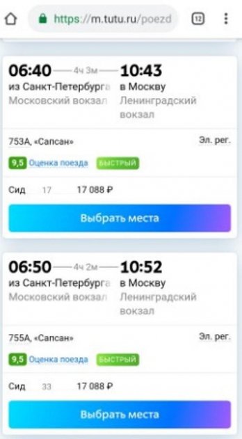 Выбор подходящего транспорта из Санкт-Петербурга в Москву теперь поставит граждан РФ в тупик. На днях россиянка предпочла РЖД авиа-перелет из-за «космических» цен на билеты. Женщина поделилась в Twitter скриншотом с известного сайта по покупке билетов. Как видно, скоростной «Сапсан» из северной столицы в Москву теперь обойдется в 17 088 рублей. «До сих пор не отошла», - описывает свое возмущение россиянка.