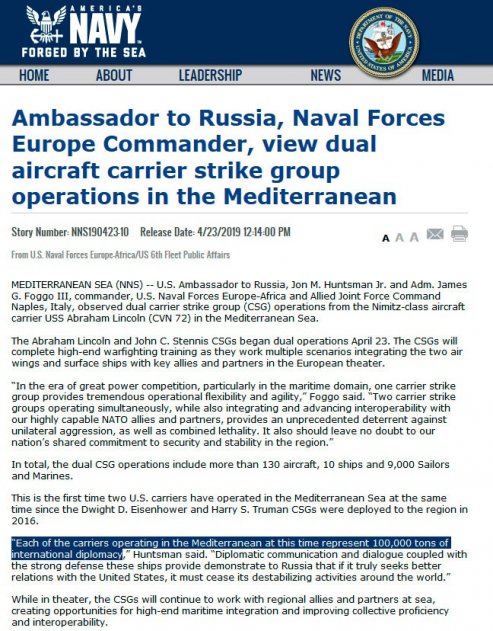 Вчера посол США в Москве Джон Хантсман побывал на авианосце Авраам Линкольн в Средиземном море и пригрозил нам войной: «Дипломатические связи и диалог в сочетании с мощными оборонительными системами этих кораблей демонстрируют России, что если она действительно стремится к улучшению отношений с Соединенными Штатами, то должна прекратить свою дестабилизирующую деятельность по всему миру».