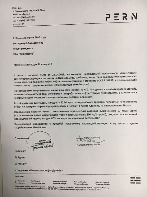 Подчеркивается, что "продолжение поставок нефти с содержанием органических хлоридов выше лимита" "рождает риск серьезной промышленной аварии". В письме говорится, что "ни один из НПЗ, находящихся на нефтепроводе "Дружба", не может принимать на свои установки и перерабатывать нефть с такими показателями, с каким она в настоящее время поставляется в пункт приемки поставок в Адамово". Отмечается, что от всех клиентов польской компании получен приказ прекратить отбор нефти с повышенными показателями содержания хлоридов.