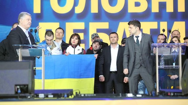 Действующий президент Украины, кандидат в президенты Петр Порошенко и кандидат в президенты от партии «Слуга народа» Владимир Зеленский во время дебатов на стадионе «Олимпийский»