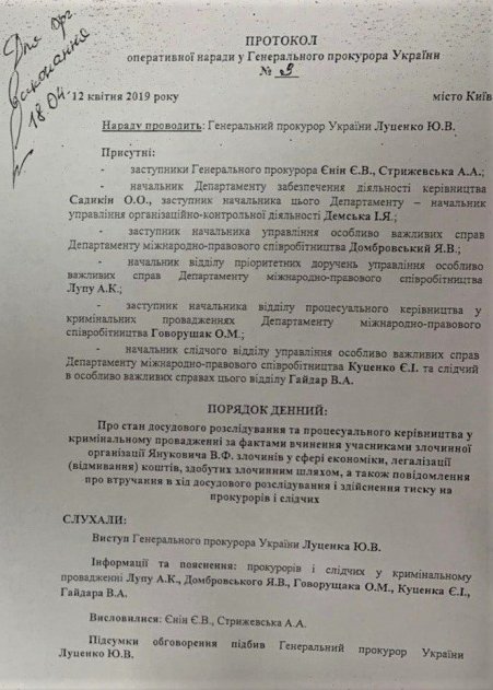 Прокурор зачитал рапорт, где указал: следствие по едва ли не самому громкому делу последних дел пытались направить в выгодное им русло представители АП, нардепы от БПП Валерий Давиденко, Игорь Кононенко и Александр Грановский, а также замы генпрокурора Евгений Енин и Анжела Стрижевская.