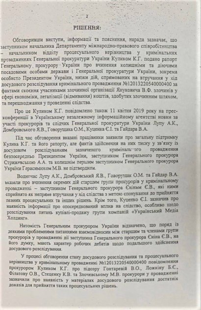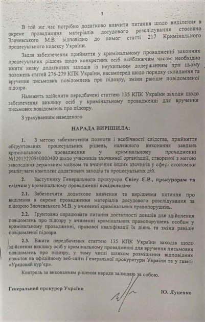 И, как следует из наложенной резолюции «к выполнению», как раз это было поручено сделать путем размещения соответствующих уведомлений о вызове данных фигурантов на допросы с целью вручения «пидозр» на сайте Генпрокуратуры и в «Урядовом курьере».
