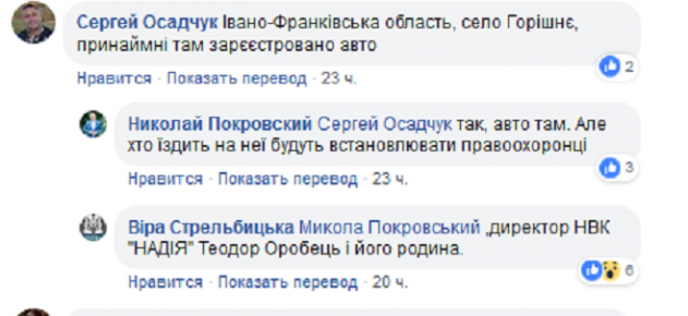 В комментариях, один из подписчиков сообщил, что данный автомобиль зарегистрирован в селе Горишне Ивано-Франковской области. Второй сообщил, что автомобиль принадлежит директору НВК «НАДІЯ» Теодору Оробцу.