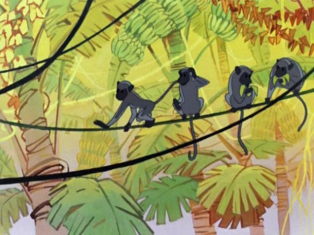 В оправдание себе обезьяны сочинили поговорку: «То, о чем Бандар-лог думает теперь, джунгли подумают позже», и это сильно ободряет их. Ни один из зверей не может добраться до Бандар-лога; с другой стороны, никто из зверей не желает замечать этого племени; вот потому-то обезьянам и было так приятно, когда Маугли пришел играть с ними, а Балу рассердился».