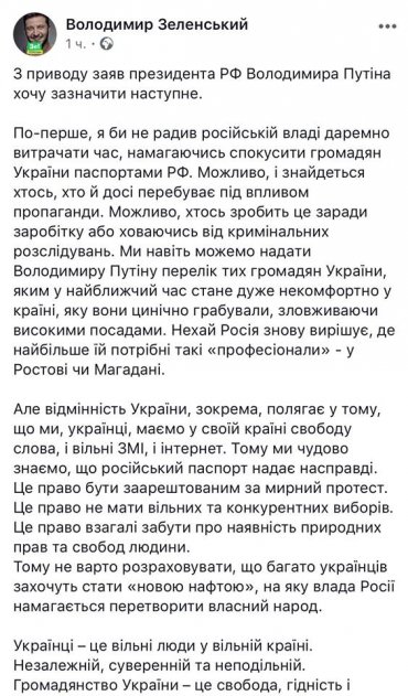 Новоизбранный Ze-президент Украины решил ответить российскому лидеру через FB, потому, вряд ли получит прямой ответ, но вполне может рассчитывать на ассиметричные действия. Его новый текст приносит хоть какую-то новизну в «белый стих» его предвыборной программы. Вот уже есть и Ze-желание сносить старых «профессионалов»-попередников. Мысль вполне похвальная, только прибежища им, вероятнее всего, искать придётся в других странах, с коими они сами связывают и свою «ментальность» и свою Недвижимость, и это точно не Россия. У кого-то домик в Испании, у кого в Италии, кто-то обзавёлся виллой на американском побережье, вот они либо туда, либо дома посидеть. Вы уж тут сами! Хотя среди них есть много тех, кого бы на Донбассе с удовольствием приняли и предложили очень нелегкий разговор.
