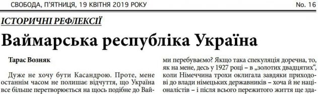 В статье «Веймарская республика Украина» Тарас Возняк, главный редактор журнала «Ї», предрекает Украине печальный конец. «Результатом развития Веймарской республики, – пишет Возняк, – стало самоубийство 1945 года. Украина тоже является неустойчивым государственным образованием, которое появилось после краха СССР… Её тоже постоянно будоражат политические катаклизмы».