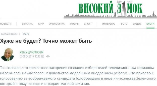 Напечатала «Свобода» и открытое письмо так называемой инициативной группы «Первое декабря», куда входят авторитетные в среде украинских националистов общественные деятели преклонного возраста – бывшие диссиденты, бывшие министры и депутаты парламента. Настроение у них паническое, они прямо заявляют о том, что народ, голосовавший за Зеленского, неправ. По их мнению, «выбор народа может быть ошибочным, Виктора Януковича также «выбрал украинский народ», и за эту ошибку расплатились со временем Небесная сотня и тысячи украинцев на войне».
