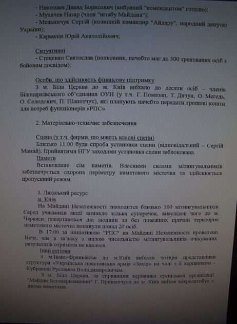 Никаких силовых столкновений, никаких призывов к свержению власти. Однако украинские силовики держат события под полнейшим контролем. Поступает информация о том, кто, где и в каком количестве устраивает мероприятия. Кто осуществляет финансовую поддержку. Какая «инфа» вбрасывается в СМИ и социальные сети. Документ объёмный. Переводить весь не вижу смыла. Желающие могут сами все прочитать.