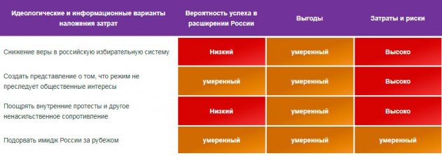 Если коротко, то санкции надо «расширить и углубить». В ответ на вмешательство в дела Западного полушария (Венесуэла) оказывать военную помощь Украине. Разговаривать с россиянами, «которые очень устали от того, что их власти занимаются Украиной, Сирией и новым оружием в ущерб школам, больницам и рабочим местам в самой России, а также от коррупции, разлагающей страну». Эти мысли вслух удивительным образом совпали с основными положениями недавно опубликованного в открытом доступе доклада одного из самых мощных мозговых трестов. Эксперты RAND Corporation исследовали варианты, направленные на нейтрализацию угроз, исходящих от нашей страны. Эти угрозы не являются смертельно опасными для США, поскольку Россия не ставит перед собой цель уничтожение геополитического противника, по крайней мере, в докладе вероятность нашего нападения нигде не упоминается. Наши усилия направлены на оборону. Тем не менее, для американцев само существование страны, способной ответить, — вызов. Правда, совет «разговаривать с россиянами», который дала Виктория Нуланд, немножко не совпадает с выводами RAND, который считает, что воздействие на население эффективным уже не является. Как-то мы слабо реагируем и не готовы взрывать собственную страну изнутри, помогая американцам в достижении их геополитических задач. Но бывшая замгоссекретаря, вдохновленная воспоминаниями об украинском Майдане, по-видимому, считает, что этот потенциал до конца не исчерпан. И ее можно понять — Украину удалось развалить за каких-то пять лет, население после победы «революции гидности» разбегается в разные стороны миллионами. Результат «разговора с украинцами» американцев напрямую, без посредников налицо. Поэтому желание повторить собственный успех в России у Виктории Нуланд, разумеется, существует. Правда, RAND Corporation считает финансирование пятой колонны затратным (см. табличку внизу). Гораздо эффективнее создание военных и экономических угроз, на которые Россия будет реагировать, затрачивая собственные средства. То есть, с одной стороны, предлагается наращивать милитаризацию вдоль наших границ, провоцируя Москву, например, на разворачивание дорогостоящих противоракетных систем. А с другой, Виктория Нуланд и другие американские ястребы через своих прикормленных российских оппозиционеров будут «разговаривать с россиянами», внушая им простенькую мыль: Путин занимается «новым оружием в ущерб школам и больницам». Между прочим, идея не так уж и плоха. И к Соединенным Штатам у меня нет никаких претензий — они пытаются купировать угрозу, которая мешает их доминированию. Это внешний враг, подлый и коварный, способный на все. Другим он быть просто не может. А вот пятая колонна — это наш внутренний враг, который помогает врагу внешнему уничтожить Россию. То есть, любыми способами — экономическими, политическими, идеологическими ослабить ее военный потенциал, воздействуя на слабых умишком, доверчивых соотечественников, которых у нас довольно много. Все серьезно, ребята. Они никогда от нас не отстанут. Вопрос «как нам уничтожить Россию», возможно, главный среди тех, что заботит американцев и мешает им сладко спать по ночам.