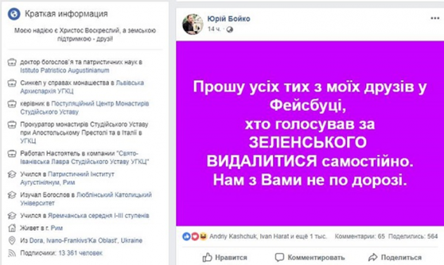 21 апреля иеромонах Юстин Бойко сделал видеообращение к своим друзьям и подписчикам на Фейсбуке, где заявил, что не следует унывать по поводу результатов выборов. А следует объединиться для дальнейшего сопротивления и борьбы. Эта запись набрала почти 1000 репостов и почти 50 000 просмотров.
