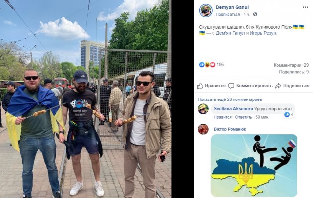 Ритуальное сожжение людей в одесском Доме профсоюзов 2 мая 2014 года нацистские мрази считают "праздником". В течение сегодняшнего дня молодые бандерлоги усиленно провоцировали людей, пришедших на Куликово поле почтить память жертв трагедии. Демонстративно глумились, вопили "слава Украине!", вступали в словесные перепалки. Вожак нацистской организации "Уличный фронт" Демьян Ганул (экс-руководитель силового блока в одесском "Правом секторе"*) и его кореша припёрлись на Куликово поле с шашлыками...