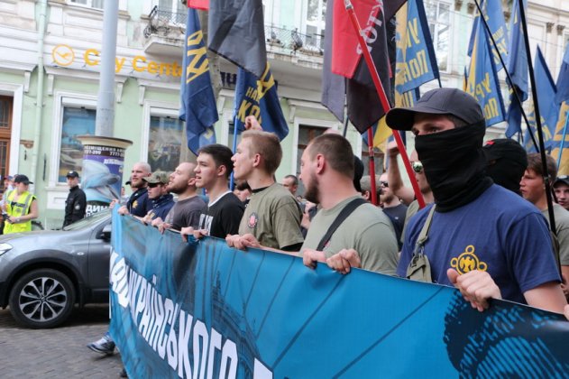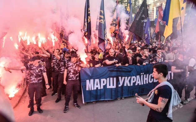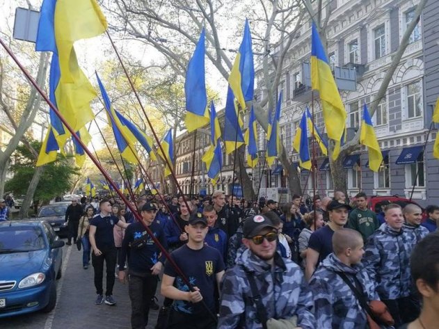 Потом состоялась хорошо подготовленная акция устрашения - "Марш украинского порядка" по центральным улицам Одессы. Сотни боевиков "Национального корпуса", "Национальных дружин", "Свободы"*, "Правого сектора"* и "Уличного фронта" шагали от памятника Тарасу Шевченко, жгли фаеры, скандируя "Одесса — это Украина!", "Слава Украине — героям слава!", "Слава героям второго мая!", "Слава нации — смерть врагам!", "Украина понад усэ!". Колонну сопровождали пешие полицейские и патрульные автомобили. Марш завершился на Греческой площади. "Пять лет назад проукраинские силы отстояли Одессу. Благодаря сплочённости ультрас и других патриотов сепаратистам не удалось создать ОНР", - провозгласил "Нацкорпус" Андрея Билецкого.