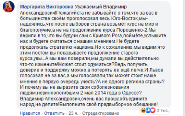 «От новоизбранного Президента хотелось бы услышать заявление по поводу трагических событий в Одессе 2 мая 2014 года. Владимир Александрович! Одесса отдала за Вас свои голоса в надежде на то, в частности, что Вы поддержите нас в нашем горе», — писали одесситы.