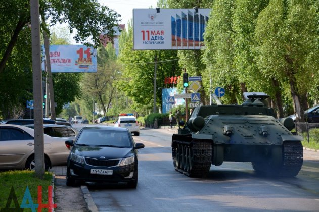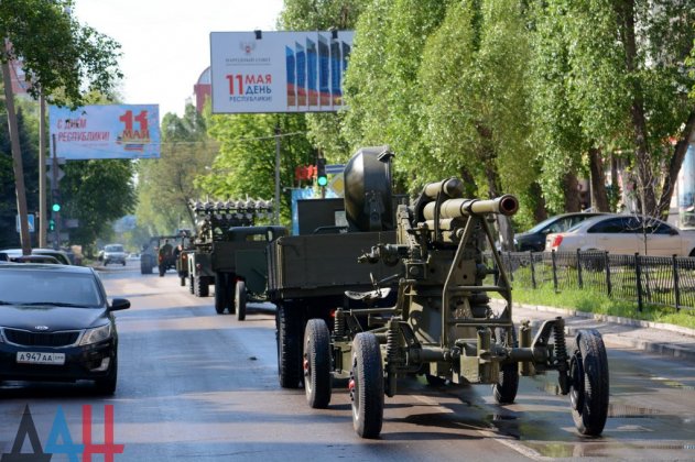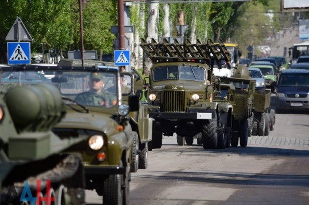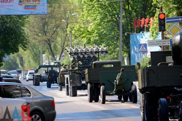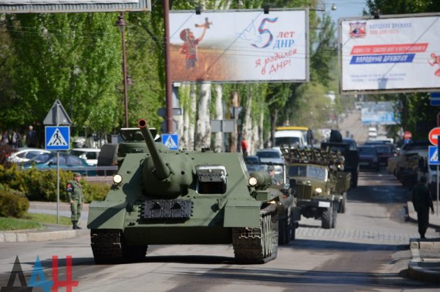 По центру столицы Республики прошла колонна техники времен Великой Отечественной войны, в частности РСЗО БМ-13 «Катюша», самоходная артиллерийская установка СУ-100, грузовой автомобиль ГАЗ-АА («полуторка»). Также на репетиции была представлена техника, стоящая на вооружении Народной милиции ДНР: танки Т-64 и Т-72, боевые машины пехоты, реактивные системы залпового огня «Град», буксируемые и самоходные артиллерийские орудия, зенитные установки и прочее. Всего в репетиции парада была задействована 61 единица техники.