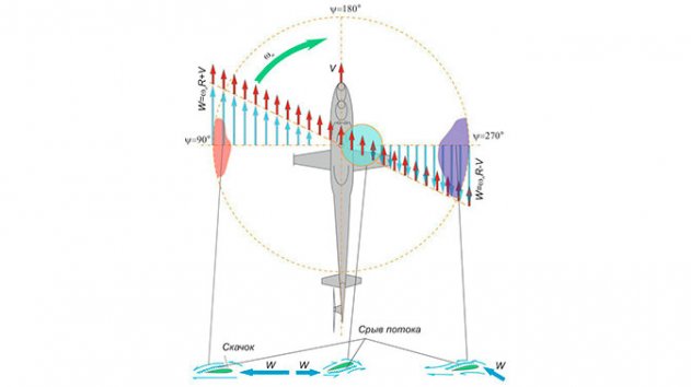 А либеральные СМИ предвосхищают: аж Запад в восторге - вот это будет техника! Заранее ликуйте!!! Расчет на простодушного Ивана, потому что у одновинтового вертолета (с реактивным двигателем он или с фенестроном сзади) есть аэродинамический ограничитель, который ни за какие коррупции не пропустит его в высокоскоростной ряд. Суть заключается в том, что с ростом скорости полета увеличивается и разница в величине тяг (подъемных сил) левой и правой половин несущего от встречного потока воздуха, а значит, будет расти крен в ту или другую сторону (у вертолетов «Ми» в правую сторону). И уже с V=400к/ч. встречный поток с одной стороны и попутный с той же скоростью с другой стороны будут так заваливать вертолет (на рисунке – зеленые стрелки), что не хватит никакого управления для его нейтрализации. Конец будет печальным и не помогут тогда хвостовой реактивный двигатель и хитрые законцовки лопастей несущего винта от Н.С. Павленко, о чем я уже писал не раз.
