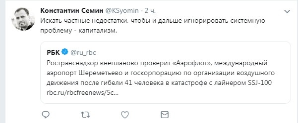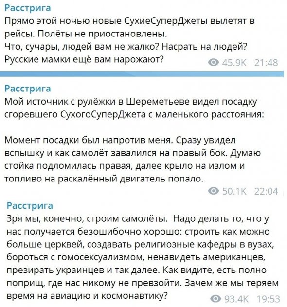 Так как сегодня в ленте будет фуршет из трупоедов разных мастей, спешно кующих хайп на трагедии, и перебивая друг друга призывающих расстрелять всех создателей "Суперджета", всю авиационную отрасль и так далее, после рыдая кататься по полу "господи как стыдно за рашку-парашку, кучку дураков и неумёх криворуких", чуток цитат с профильных авиационных форумов. Сквок(*) на 7700 был поставлен в 15.25 - с этого момента считаем 30 секунд на объявление тревоги. Напомню, что самолет уже 14 минут без связи, и у диспетчеров нет информации о том, что происходит на борту. *Сквок (squawk code) - автоматический кодированный ответ специального устройства: Ответчика управления воздушным движением (УВД). Код 7700 означает "Авария или другая нештатная ситуация на борту" Еще 3 минуты есть у СПАСОП (Служба поискового и аварийно-спасательного обеспечения полетов) чтоб облачиться в огнезащиту и вывести технику из гаражей (90 секунд для первой очереди - это 1-2 расчета, вдвое больше для всех остальных). Примерно через 2 минуты после "сквок 7700" пожарные получают от диспетчеров информацию о типе самолета (от него зависит схема действий), предполагаемой полосе и курсе посадки. Дальше все просто: т.к. нет данных, что случилось - пожарные следуют к предполагаемому месту приземления и встают там не ближе 120 метров от полосы (вдоль полосы они выстраиваются только в кино). Как только самолет проносится мимо них - машины стартуют и "догоняют" самолет. Самолет, коснувшийся полосы на 250-290 км/ч (а то и быстрее) - на 20-тонных пожарках с полными бочками воды! Естественно, они не смогут быть быстрее самолета - и на видео, кстати, видно, что первая машина развернула ствол буквально через 40-50 секунд после остановки самолета - это реально очень быстро, это надо гнать со всей дури не только по бетону, но и по полю!" Самолёт садился без связи. На момент посадки вертикальная скорость была ощутимо превышена, поэтому он "прыгает", судя по видео, на высоту нескольких метров от полосы. Ломает шасси и черкает хвостовым оперением и баками по бетону. Самолёт - не БТР, нет самолётов с прочностью, чтобы выдержать такой физический контакт, любой или развалился бы или загорелся. Но разве всё это помешает сравнить ситуацию с "а в американском фильме всех спасают"? Сравнение реальности и образов из масс-медиа и СМИ - уже норма; накал идиотии такой, что на сегодняшний день реально могут предъявить "А вот в США бы прилетел Железный Человек и всех спас, руками придержав самолёт. Но у нас же телеги и всё". И сделать из "При аварийной посадке, когда отказала связь и загорелся самолёт, удалось спасти больше половины пассажиров" повод для 157 видеороликов с надуванием губ и "Вот вам и система с вертикалью. И это всё что вам надо знать о всех проектах России во всех областях науки и техники. Зато крымнаш. Надо больше марксистских кружков. При СССР такого бы не случилось". Со стандартными т.е. проклятьями-заклинаниями-мемами, выкатываемыми по любому поводу и без. Сегодня этого будет много. Пристегнитесь. Размышлениями поделился блогер Руслан Карманов PS. (из камментов): И у нас в конкурсе "пидор дня" есть явный лидер - Сергей Доренко. Зацените накал и плотность мемов. Прямо вот как по бумажке. Церкви упомянуты, борьба с гомосексуализмом. Самое то, что отношение имеет к аварийной посадке. Впрочем, хохлов трудно переплюнуть даже ему: Мразь Шевченко не 