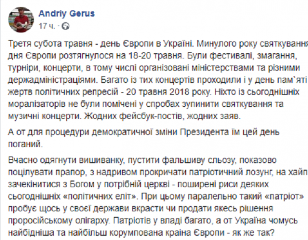 «Никто из сегодняшних морализаторов не были замечены в попытках остановить празднования и музыкальные концерты. Никаких фейсбук-постов, никаких заявлений. А вот для процедуры демократической смены Президента им этот день плохой», — отметил Герус.