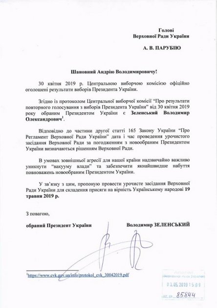 Владимир Зеленский на встрече с руководителями фракций парламента в субботу, 4 мая, предложил дату инаугурации 19 мая.
