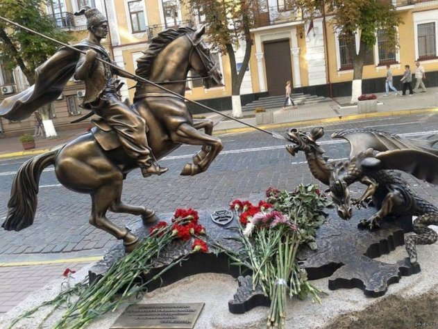 Но по-любому факт остается фактом: знают в Украине, кто такой Георгий Победоносец и что с ним связано в славной ратной истории, до недавних пор касающейся непосредственно и Украины. Не зря же даже у главного здания СБУ, превращенной в карательную политическую охранку на страже «завоеваний майдана», в 2105 году установили памятник-стилизацию «под Георгия» - «Казак-победитель» на коне попирает копьем то ли дракона, то ли змия: