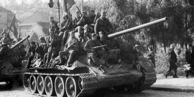 Танки Т-34-85 55-й гвардейской танковой бригады въезжают в Прагу 9 мая 1945 года