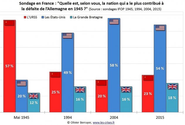 Результаты опроса французов показывают, что с годами оценка вклада СССР в победу над фашизмом неуклонно снижалась.