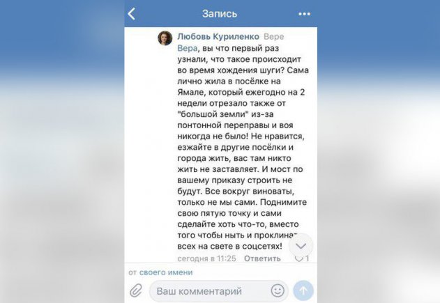 — Не нравится, езжайте в другие посёлки и города жить, вас там никто жить не заставляет. И мост по вашему приказу строить не будут, — написала Иванцова.