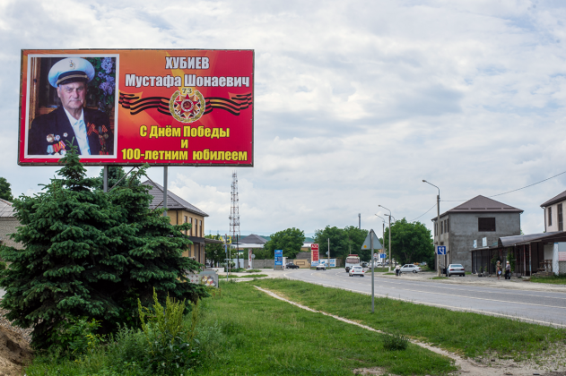 Плакат к 100-летнему юбилею ветерана, установленный на въезде в Усть-Джегуту в 2018 году