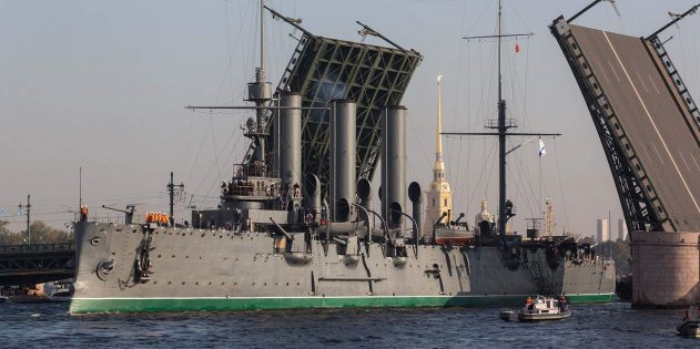 «Аврора» проходит Дворцовый мост, направляясь на ремонт Например, крейсер I ранга «Аврора». Прошедшая совсем недавно реконструкция обошлась государственному бюджету в 840 миллионов рублей (13 миллионов долларов). За эти деньги корабль отбуксировали в сухой док, проверили днище, почистили, подкрасили, обновили экспозицию и вернули «Аврору» на место.