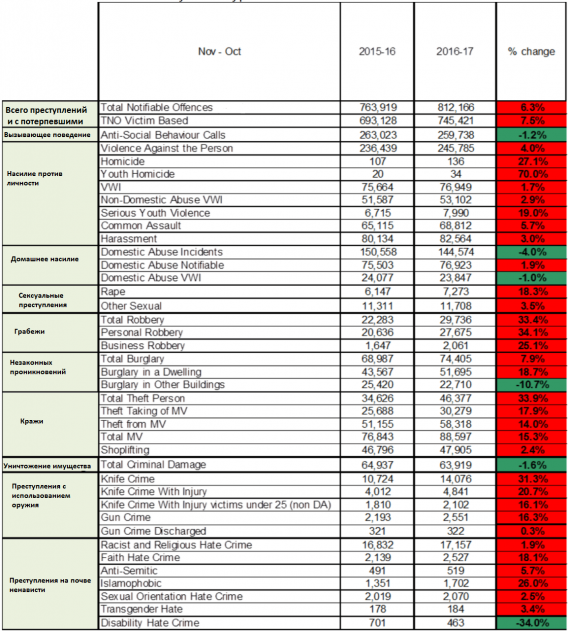 В 2018 году общий рост преступности в Великобритании (статистика по Англии и Уэльсу) по сравнению с 2017 годом составил 6% (держим в памяти политику по игнорированию части преступлений). Количество убийств увеличилось так же на 6%, насилий в отношении личности на 19%, сексуальные преступления, в среднем на 11%, количество преступлений с использованием оружия увеличилось на 21%, согласно официальной статистике.