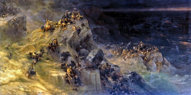 «Всемирный потоп», картина И. Айвазовского Такое регулярно происходило и в Северной Африке, где ещё не перегороженный плотинами Нил тоже разливался до горизонта, и только отдельные каменные холмики выступали из воды. Древние люди сидели на этих холмах, клепали свои каменные орудия и ждали, пока вода спадёт. Так что потопы в их мифах — это не какая-то выдумка. Они и сейчас бывают: Приамурье затапливает каждый год, в моей родной Чите дачные посёлки регулярно смывает.