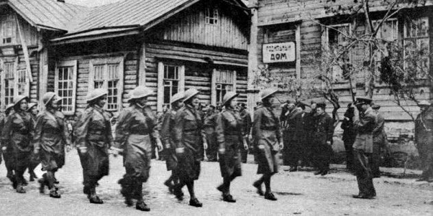 Воины чехословацкого корпуса маршируют по украинскому селу