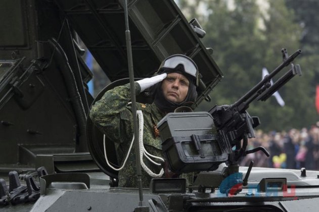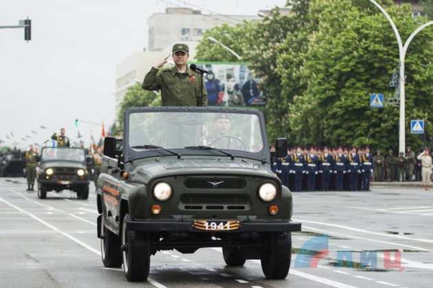 Парад принял глава ЛНР Леонид Пасечник, который обратился с поздравительной речью ко всем собравшимся.