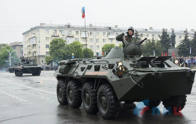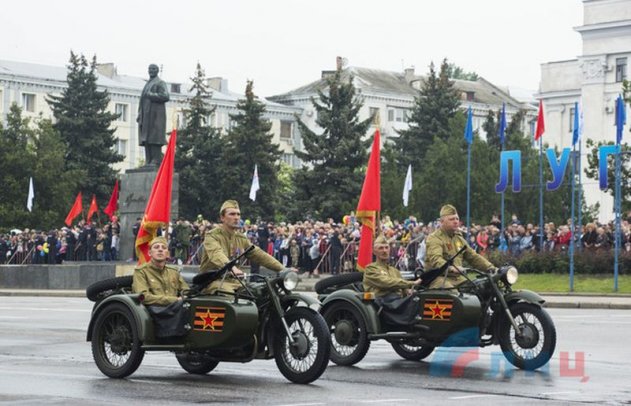 Парад военной техники и вооружения, как и в Донецке, возглавил танк Т-34 в сопровождении военных мотоциклов времен Великой Отечественной войны.