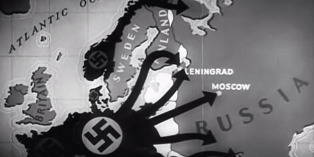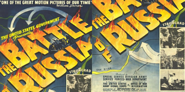 Героизм борьбы Советского Союза против Третьего рейха настолько впечатлил мир, что в Голливуде решили снять об этом специальный фильм. Какими во время войны американцы видели русских — в нашей статье. Спросите своих знакомых, что они думают о США — нашем союзнике во Второй мировой войне. «А что, они разве за нас воевали? А они разве не Гитлеру помогали? И мирный Дрезден поэтому же разбомбили — чтоб нам побольше нагадить! И со Вторым фронтом тянули! И вообще, они всё время против СССР готовились воевать — я вчера в интернете видел!». Вот и все познания. Или ещё меньше. Давайте же посмотрим, что на самом деле думали и говорили американские военные и политики в разгар войны. Как они видели нашу страну? И что знали тогда об СССР простые американцы? Битва за Россию Тысяча девятьсот сорок третий год. Пик Второй мировой войны. Чтобы воевать, нужны миллионы солдат. Но как объяснить мирным жителям в далёком тылу, почему мы сражаемся? Ради чего я, Джон или Сэм должны вдруг плыть за океан и воевать с каким-то немцами, когда у нас в США живут сотни тысяч граждан Германии? Идея — собираем лучших киношников Голливуда! И снимаем документальный цикл «Почему мы сражаемся» (Why we fight). Режиссёр Фрэнк Капра — классик кино о простых людях. Анатоль Литвак — родился в России, снимал фильмы об этих загадочных русских. Сценаристы, близнецы Эпштейны, только что написали сценарий для легендарной «Касабланки». Выпускник Петербургской консерватории композитор Дмитрий Тёмкин отвечал за музыку. Оператор Роберт Флаэрти снял настолько крутой фильм «Нанук с севера» о жизни эскимосов, что в честь героев кино назвали мороженое (да, за эскимо «спасибо» именно Флаэрти). То есть нашли самых ярких профессионалов. Они смонтировали лучшие художественные фильмы, выпуски новостей и хронику, включая трофейную, и в 1943 году выпустили документальный фильм «Битва за Россию». Обычный формат серии «Почему мы сражаемся» — 52 минуты, но тут сняли две части, общей длиной в полтора часа. Уж очень о многом надо было рассказать. И о чём же? От Невского до Сталина Первые титры. Самые влиятельные люди США — Генри Стимсон (военный министр), Фрэнк Нокс (секретарь флота), Джордж Маршалл (глава штаба армии), адмирал Эрнест Кинг, генерал Дуглас Макартур публично хвалят отвагу людей Советской России, говорят о неоплатном долге перед армией и народом СССР и восхищаются его героической обороной. «История не знает примеров большего мужества, чем то, что показывают люди Советской России». Звучит «Полюшко-поле» «Это фильм о людях, которые сокрушили миф о непобедимости нацистов». Как же они смогли? Для лучшего понимания воли «наших союзников», то есть русских, к свободе, «Битва за Россию» начинается с кадров великого «Александра Невского». Оказывается, эта битва шла столетиями. Зритель видит, что ещё в XIII веке немцы хотели захватить северо-запад России. «За Русь!» Потом пришли шведы — пока их не разбили под Полтавой. Потом французы — и вновь захватчиков разгромили. Потом 1914 — опять немцы! И кадры уже настоящие. «В этот раз лишь крах Германской империи спас Россию от потери Украины и Крыма». Что же их всех тянуло в Россию — тут что, мёдом намазано? Дело в том, что Россия, а позже Советский Союз, — крупнейшая страна мира. Шестая часть суши — три площади США. С запада на восток Россия (точнее, Союз Советских Социал
