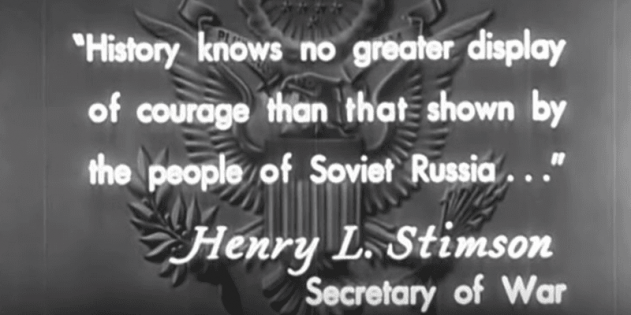 Первые титры. Самые влиятельные люди США — Генри Стимсон (военный министр), Фрэнк Нокс (секретарь флота), Джордж Маршалл (глава штаба армии), адмирал Эрнест Кинг, генерал Дуглас Макартур публично хвалят отвагу людей Советской России, говорят о неоплатном долге перед армией и народом СССР и восхищаются его героической обороной.