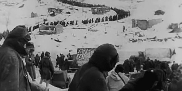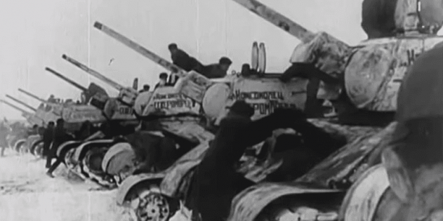 «История не знает примеров большего мужества, чем то, что показывают люди Советской России». Звучит «Полюшко-поле» «Это фильм о людях, которые сокрушили миф о непобедимости нацистов». Как же они смогли?