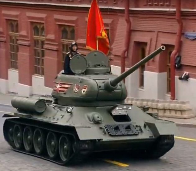 2. Открывало парад знамя Победы, а потом, добивающим, ещё гвардейская «тридцатьчервёрка» с красным знаменем (не говоря уже о том, что многие части, участвовавшие в параде, шли с полковыми красными знамёнами).