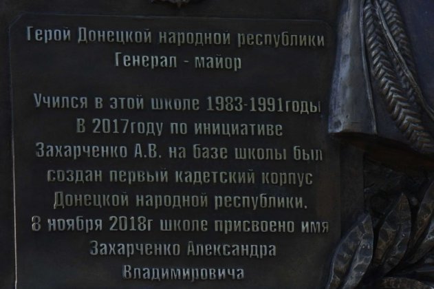 Сегодня, 10 мая, в Донецке открыли мемориальную доску в честь первого Главы ДНР, Героя Донецкой Народной Республики Александра Захарченко (1976–2018). Она установлена на здании Республиканского общеобразовательного учреждения «Школа № 4 – Кадетский корпус им. А.В. Захарченко», в стенах которой он учился. В мероприятии приняли участие действующий Глава ДНР Денис Пушилин, Президент Республики Южная Осетия Анатолий Бибилов, депутат Государственной Думы Федерального Собрания Российской Федерации Казбек Тайсаев, другие официальные лица.
