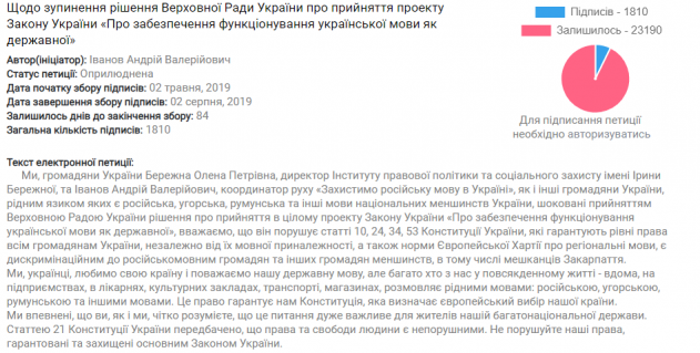 На сайте Верховной Рады петиция “О приостановлении решения Верховной Рады Украины о принятии проекта Закона Украины “Об обеспечении функционирования украинского языка как государственного”, набрала уже 1810 голосов.