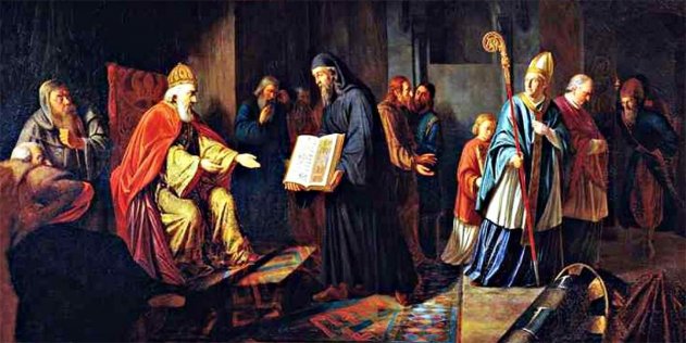 «Великий князь Владимир избирает религию», художник — И. Эггинк Русь не получила бы крещение от Византии. Если в конце X века это была могущественная и богатая империя, то в начале XIII столетия некогда великое государство разделилось на несколько враждующих стран, часть которых, во главе с Латинской империей, ещё и находилась под управлением католиков. После событий IV Крестового похода и взятия Константинополя франками принятие христианства автоматически означало бы выбор католической веры и подчинение власти Рима.
