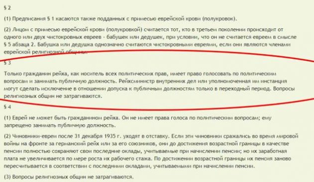 Вообще, к этой пояснительной записке больше подходили бы не выводы Венецианской комиссии, а некоторые пункты «Нюрнбергских законов» 1935 года о праве на гражданство в Третьем рейхе. Если слово «рейх» заменить на «украинский язык», то мы увидим много общего. Вот там есть такой пункт: «Только гражданин рейха, как носитель всех политических прав, имеет право голосовать по политическим вопросам и занимать публичную должность». Разве это не созвучно с законом №5670-д, согласно которому русскоязычный человек не имеет политических прав?