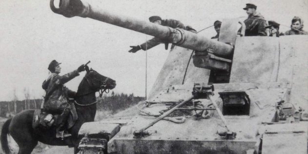Вестовой передает сообщение экипажу немецкой «Хорниссе», которая с начала 1944-го стала называться «Насхорн» Оставленные грузовики и легковушки немцы бросали или даже безжалостно сжигали. Дым от горящих покрышек стелился над западной Украиной. Собственно, эти машины стали частью из 37 тысяч автомобилей, подсчитанных трофейщиками 1-го Украинского фронта с четвёртого марта по десятое апреля 1944 года. Из армии подвижной вермахт неуклонно становился малоподвижной.