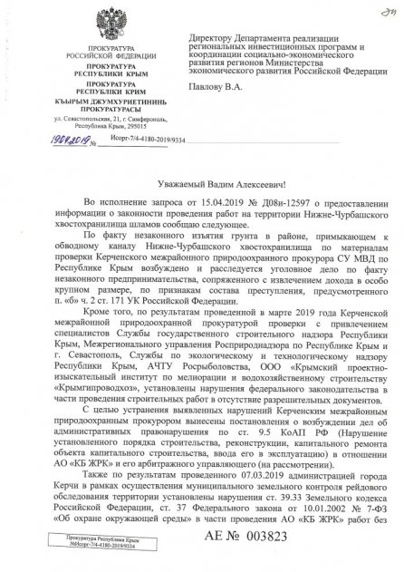 Безусловно, у жителей Керчи осталось много вопросов к надзорным органам о законности проведения работ в районе хранилища отходов металлургического производства. Возможно, беспокойство жителей города вызвано опасением за состояние экологии в восточном Крыму, возможно — примером безнаказанной выемки песка из тела заградительной дамбы Нижне-Чурбашского хвостохранилища, которая была разобрана и вывезена на строительные объекты как сыпучий материал и восстановлена по требованию прокуратуры только в 2018 году.