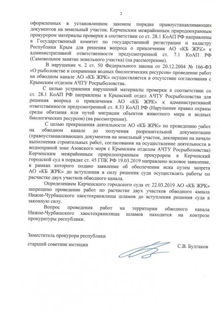 Определением суда от 22.03.2019 года АО «КБ ЖРК» запрещено производить работы по расчистке двух участков обводного канала до вступления решения суда в законную силу. «Вопрос проведения работ на территории объекта находится на контроле прокуратуры Крыма», — говорится в ответе надзорного ведомства.