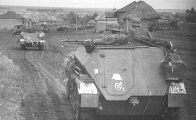 Бронетехника 2-го разведывательного батальона дивизии "Великая Германия" на марше села Девица