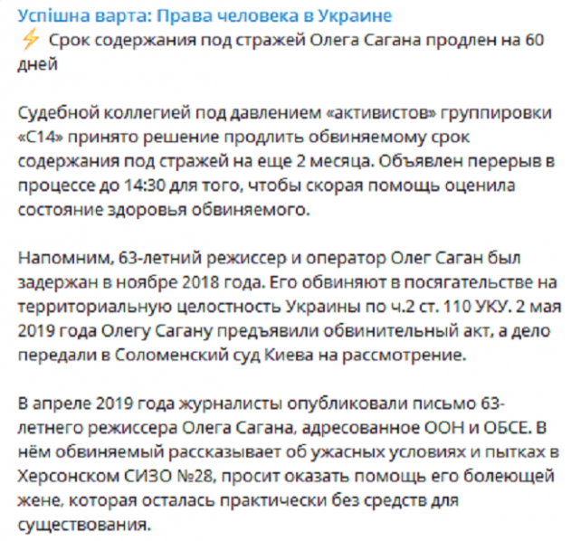 Сегодня в Соломенском районном суде Киева состоялось заседание по делу режиссера и оператора Олега Сагана, которого обвиняют в посягательстве на территориальную целостность страны. Суд под давлением радикалов «С14» продлил меру пресечения Олегу Сагану.