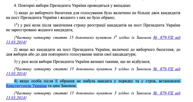 Статья 15, п. 4 предполагает проведение повторных выборов президента Украины в случае, если «Лицо после его избрания не получило мандат в срок и способом, предусмотренным Конституцией и этим законом».