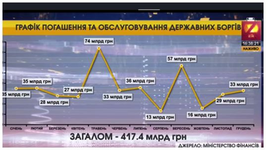 Сейчас середина мая. Статистика есть за первый квартал плюс апрель. Как следует из сообщения Минфина, государственные заимствования за январь-апрель 2019 года составили около 158,5 млрд. грн. Другими словами, за четыре месяца года мы выбрали почти половину годового лимита на долги. Ладно, допустим, что дело в отсрочке транша МВФ, который планировался в этом месяце, а когда реально дадут, пока неизвестно, и пиковом периоде выплат по долгам. Действительно, если посмотреть помесячный график, то именно в нынешнем мае мы должны отдать больше всего в текущем году – 74 млрд. грн.